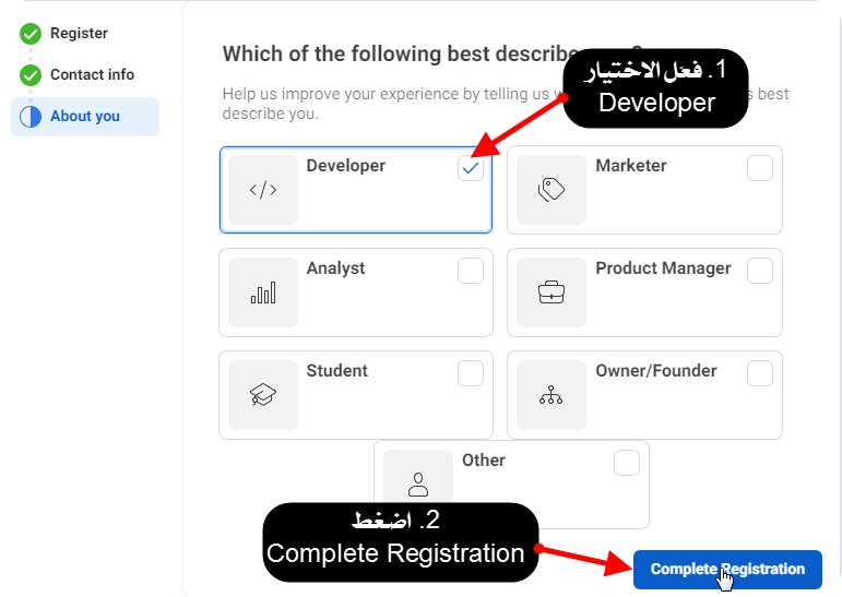 - اضغط علامة "صحّ" بجانب كلمة (Developer)، ثمّ اضغط Complete Registration.
