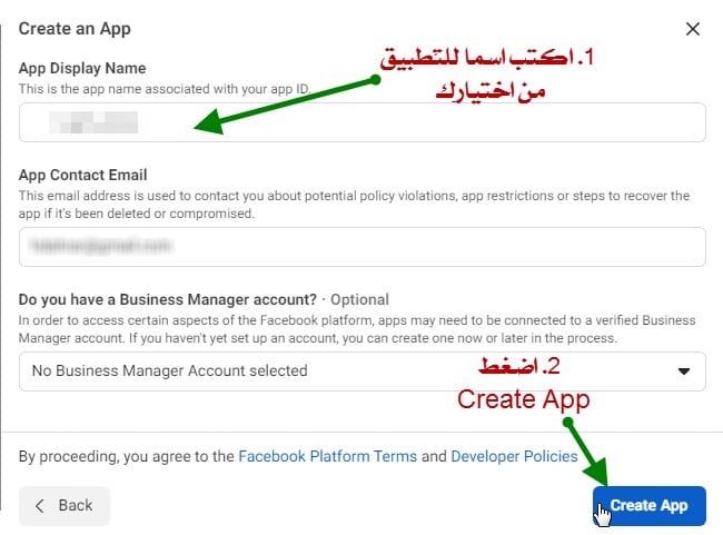 - إذا امتلكت حسابا تجاريّا، يمكنك اختياره من الخانة الثّالثة. وإلاّ فدعها كما هي، واضغط Create App.