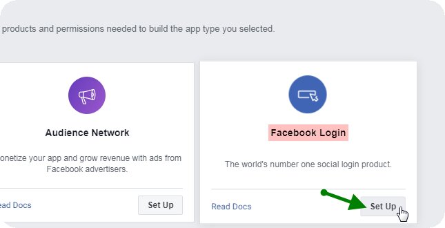 - بما أنّنا نستهدف خدمة تسجيل الدّخول عبر فيسبوك، فلنختر Facebook Login. اضغط عندها Set Up.
