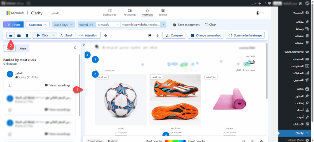 بمجرد إدخال الرابط قامت الأداة بتحميل الخريطة الحرارية لصفحة المتجر ومن خلال الأيقونات العلوية تأكدت من تحديد عرض جهاز الكمبيوتر لمعاينة سلوك الزوار بدقة.