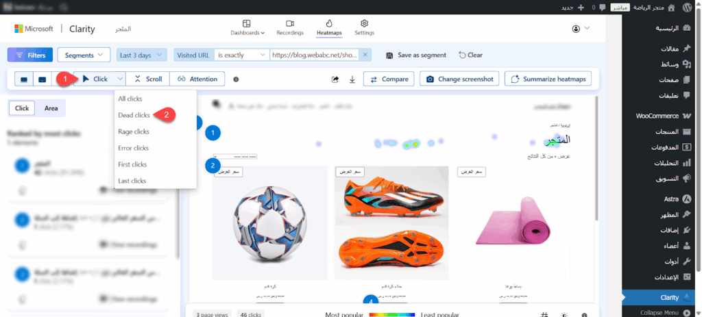 الوضع الافتراضي للخريطة الحرارية يعرض جميع النقرات وهو خيار يعطي صورة عامة تشمل النقرات الفعالة والميتة معاً. لعزل المشكلة والعثور على النقرات المميتة نقرت في القائمة العلوية على Click وغيرت الخيار إلى Dead clicks.