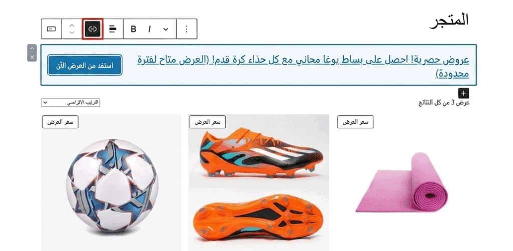 لحل هذه المشكلة دخلت مباشرة إلى محرر صفحة المتجر في ووردبريس وحولت النص الترويجي إلى رابط تفاعلي ينقل من ينقر عليه فوراً إلى صفحة الشراء المخصصة لهذا العرض في ووكومرس. ولزيادة الوضوح غيرت لون النص ليبدو كرابط وأضفت بجانبه زراً صغيراً بعنوان استفد من العرض الآن.