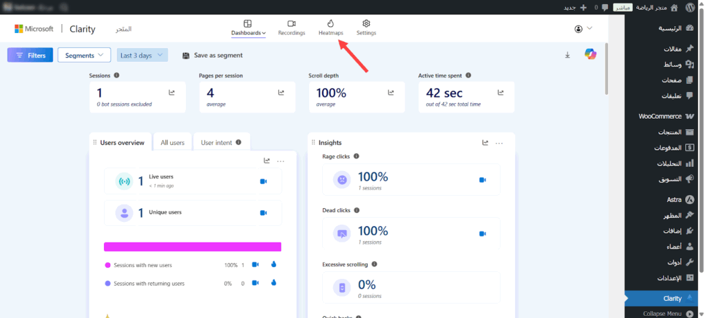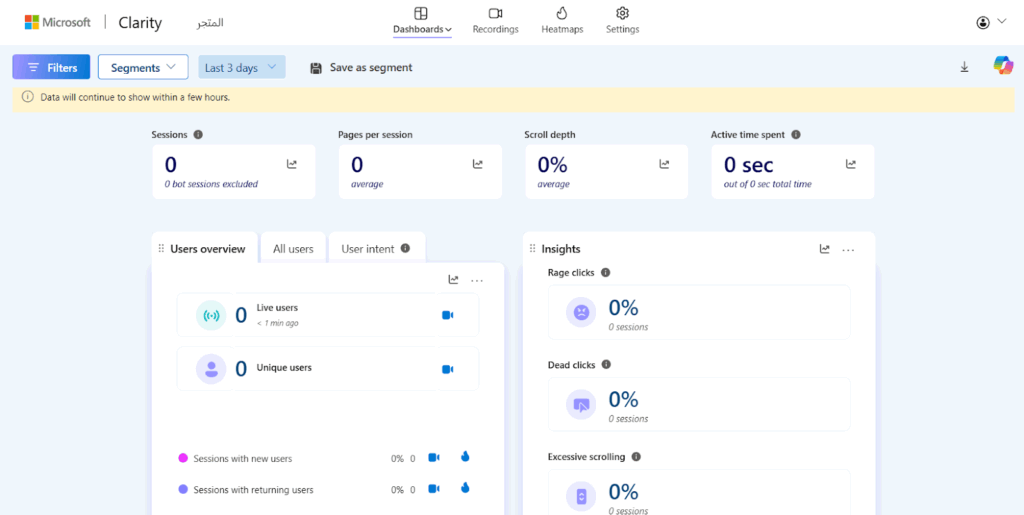 تم فورًا ربط المتجر بأداة Microsoft Clarity دون الحاجة لمغادرة لوحة التحكم وظهرت لي لوحة التحكم الخاصة بالأداة، وبدأت فورًا عملية رصد الزوار وجمع البيانات من أجل التحليل.