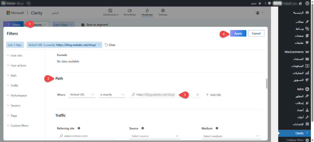تعرض الأداة افتراضياً الخرائط للصفحات الأكثر زيارة، ولكن للحصول على الخريطة الحرارية الخاصة بصفحة المتجر تحديداً استخدمت فلتر الرابط المزار، حيث نقرت على زر Filters وتوجهت إلى قائمة Path ثم وضعت رابط صفحة المتجر ضمن الحقل الموجود ونقرت على Apply.
