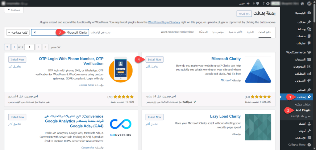 بداية دخلت إلى لوحة تحكم ووردبريس الخاصة بالمتجر وتوجهت إلى تبويب إضافات ثم نقرت على أضف إضافة وكتبت اسم الإضافة Microsoft Clarity في مربع البحث ثم ثبتها وفعلتها بالطريقة الاعتيادية.