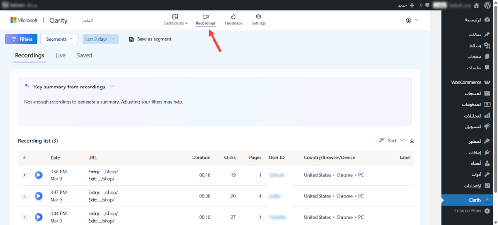 لمعرفة سبب تخلي الزوار عن سلات التسوق انتقلت إلى تبويب تسجيلات الجلسات (Recordings) لمشاهدة شاشات المستخدمين الذين وصلوا لصفحة الدفع وغادروا فجأة.