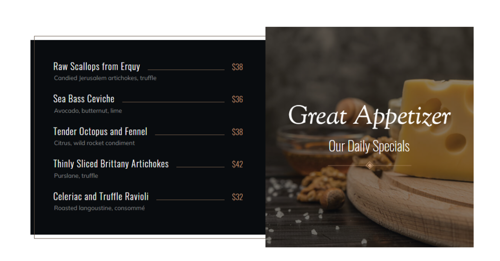 - وجود تخطيطات مختلفة: حيث يمكنك تخصيص العنوان بالشكل واللون الذي تريده، واستبدال عربة التسوق بزر اتصال مباشر، وإنشاء قائمة منتجات مختلفة مع حقائق غذائية محسوبة مسبقاً.