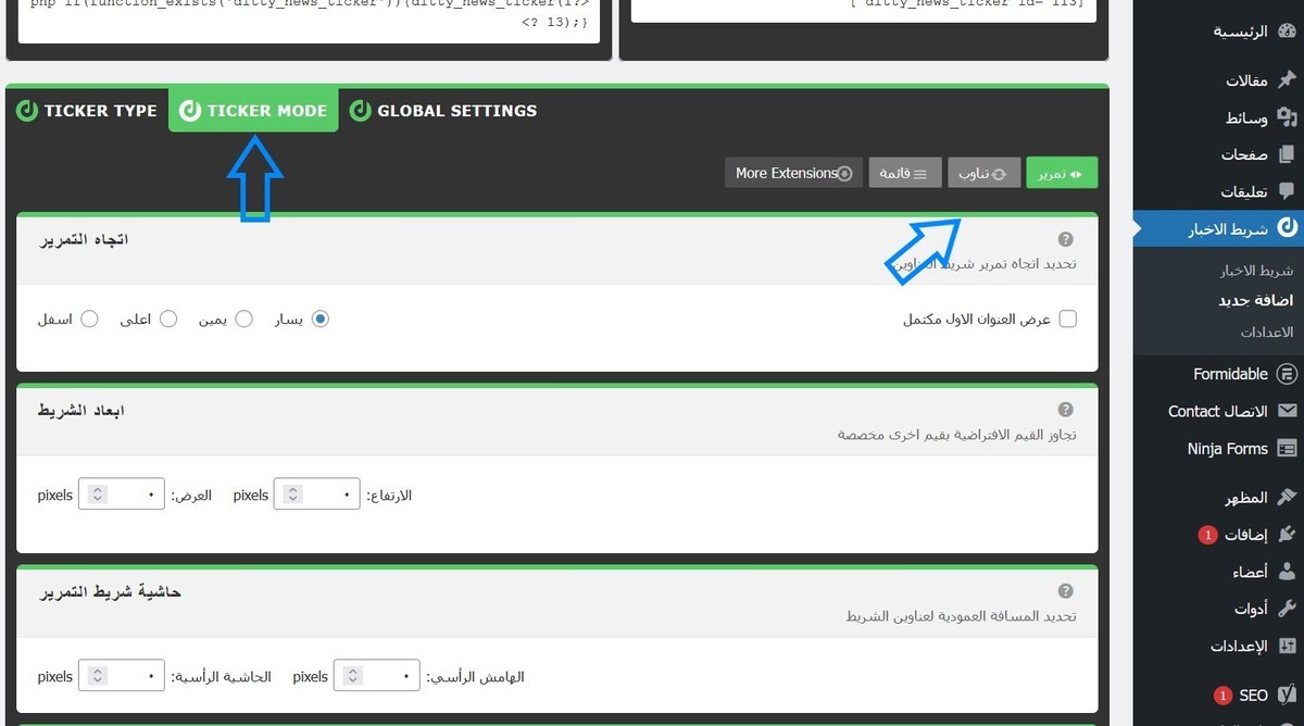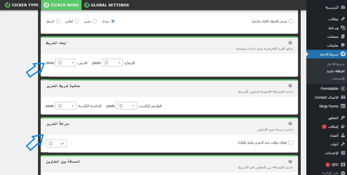 - Timer: [wp_ticker timer=”3000″] (سرعة التحكم في شريط التمرير).