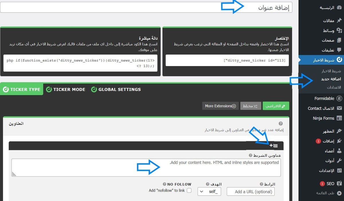 - Link: [wp_ticker link=”true”] (يمكنك إزالة رابط الشريط).