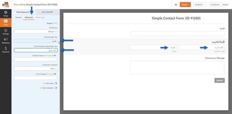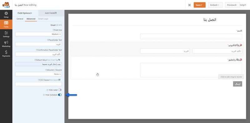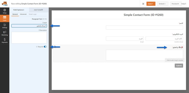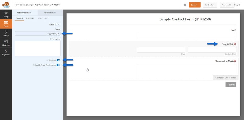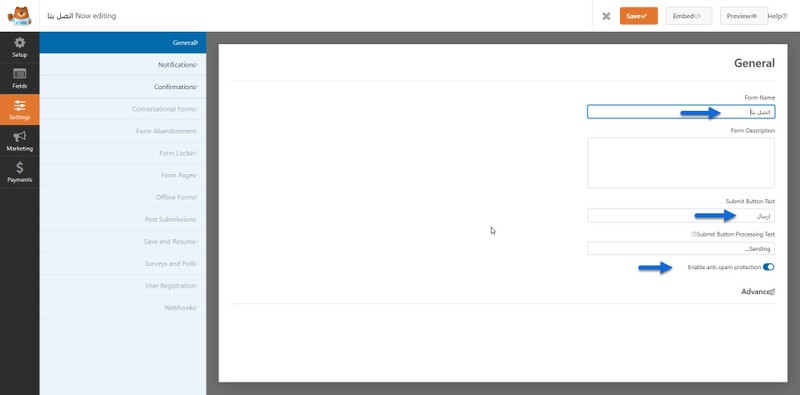 تستطيع التعديل على النموذج مثلما تريد وباللغة التي تريد في settings بعد التغييرات التي تريدها تضغط على save