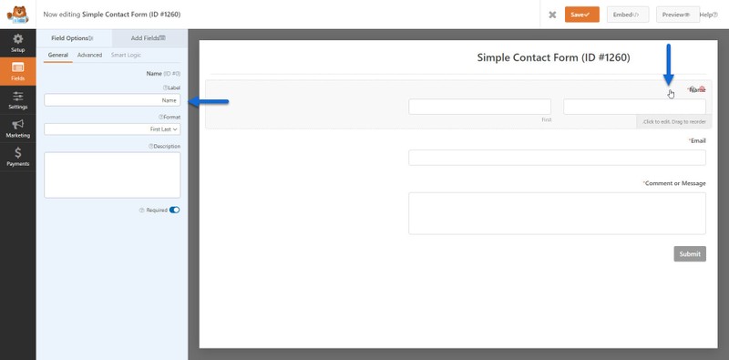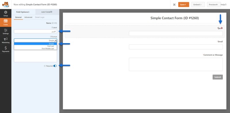 ثم تضغط على option تذهب إلى جانب الصفحة في الخانة form setting تضغط وتختار simple contact form
