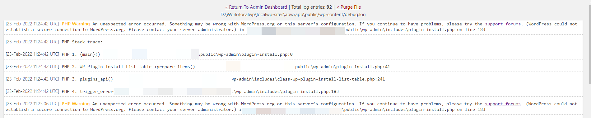 وأنا أعمل على السيرفر المحلي لدي، كُنت أجرب إضافة plugin جديدة، ولكن صفحة الإضافات نفسها علّقت عندي وأخذت ثواني ولم تفتح بالشكل المعتاد. فتسجل لدي هذا السجل.