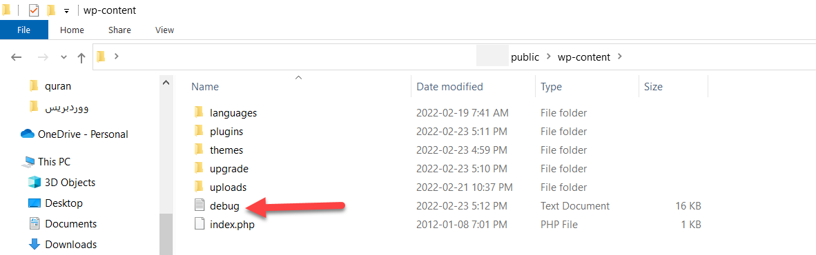 سواء استخدمت الطريقة اليدوية أو الإضافة. ما يحدث أن هناك ملف نصي باسم debug يُنشئ في الفولدر wp-content، وفيه يتم تسجيل كافة الأخطاء التي تحدث.