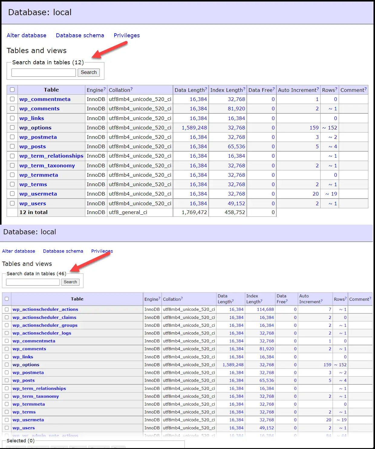 لأجل إجراء تجربة حذف كاملة، قمت بتثبيت وتفعيل إضافة الووكومرس الشهيرة، وكما ترى في الصورة التالية أن عدد الجداول كان 12 وبمجرد تفعيل الووكومرس أصبح عدد الجداول 46، أي بزيادة 34 جدول جديد.
