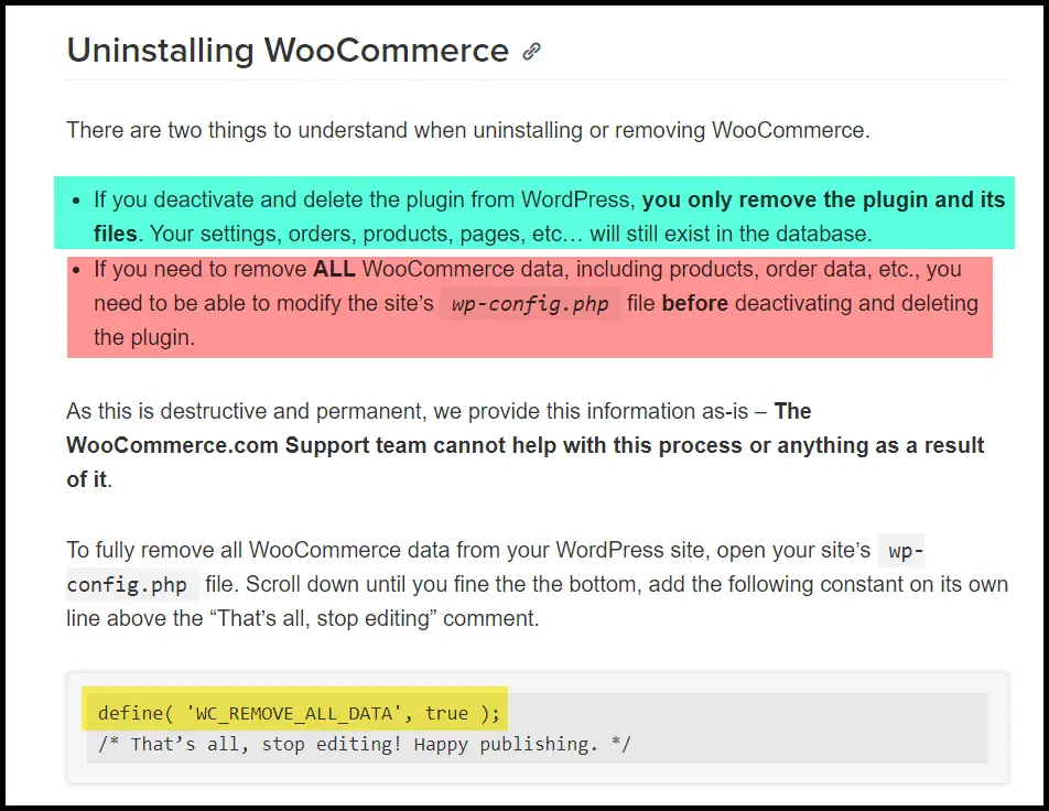إذا أردت حذف الإضافة بالكامل، فيجب وضع الكود المظلل باللون الأصفر في ملف wp-config.php قبل تعطيل وحذف الإضافة من لوحة التحكم.