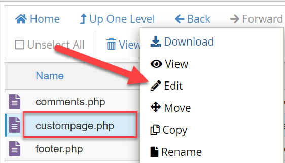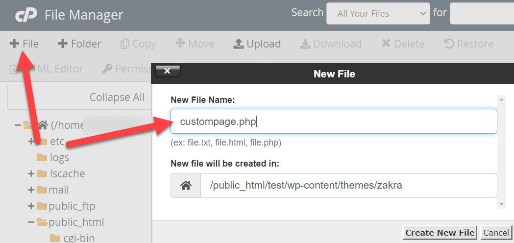 أولا يجب ان نقوم بإنشاء ملف الكود البرمجي للصفحة المخصصة المراد إنشائها داخل الووردبريس، وذلك من خلال الدخول الى مدير الملفات الخاص بالموقع، ثم التوجه الى ملف القالب الفعال على الووردبريس ونضغط على زر انشاء ملف جديد New File ونكتب اي اسم نريده للصفحة المراد إنشائها وليكن على سبيل المثال Custompage لكن من المهم جدا ان تقوم بكتابة الإمتداد php. في نهاية اسم الصفحة ليكون Custompage.php