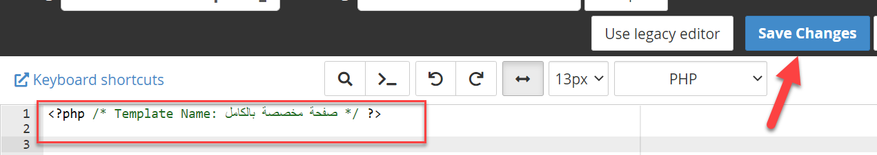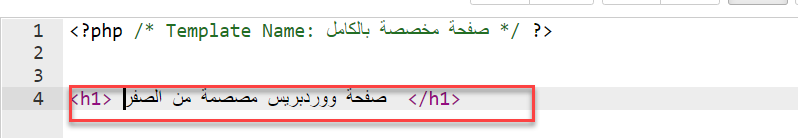 الأن يفتح الملف فارغا تماما، واول كود يجب اضافته هو الكود التعريفي للصفحة لكي يتعرف عليها الووردبريس وتكون جاهزة للعرض ضمن صفحات الموقع المتواجدة داخل لوحة تحكم الووردبريس.