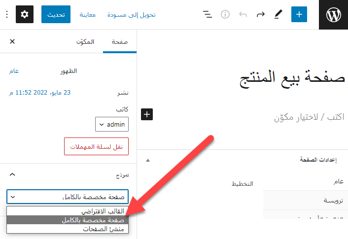 الأن كما لاحظنا ان النموذج الخاص بالصفحة اصبح يظهر في نماذج قوالب الصفحات في الووردبريس، وهنا نكون قد وصلنا الى الهدف المنشود وهو تطبيق تصميم مخصص على صفحة الووردبريس بدون الالتزام بالتصميمات او الخيارات التي يقوم قالب الووردبريس الفعال بتطبيقها على الصفحات الجديدة التي يتم إنشائها داخل الووردبريس.
