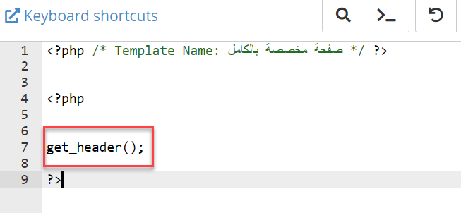 يمكننا ايضا اضافة دوال الووردبريس التي تتعامل مع أجزاء القالب الفعال على الموقع مثل دالة Get_header التي تستخدم لاستدعاء الهيدر العلوي للقالب، وسنقوم بتجربتها الأن وكتابتها داخل الملف البرمجي للصفحة: