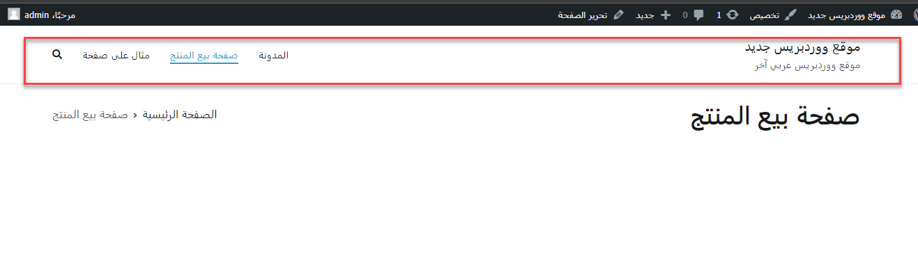 اذا قمنا بعمل حفظ للصفحة ثم انتقلنا الى رابط صفحة الووردبريس سنلاحظ ظهور الهيدر العلوي لقالب الووردبريس أعلى الصفحة: