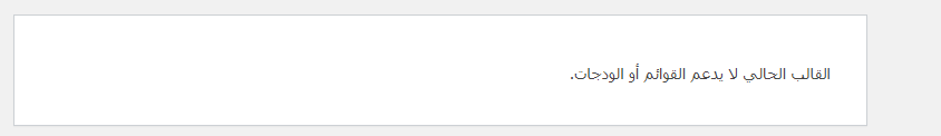 الغريب ايضا انه اذا كنت بالدخول الى رابط تحرير قوائم الموقع عن طريق كتابة المسار التالي بعد رابط موقعك : wp-admin/nav-menus.php فستجد ان الرابط لم يعد يعمل في الاصدار الجديد خصوصا مع قوالب البلوكات الجديدة وذلك وتظهر لك صفحة تخبرك بأن القالب الحالي لا يدعم تحرير القوائم:
