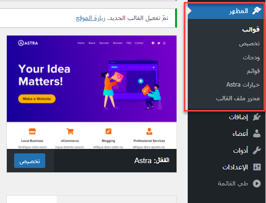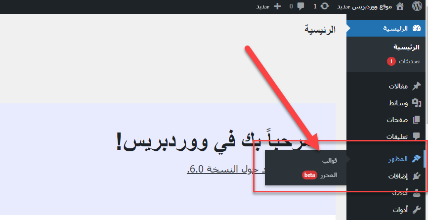 احد الطرق التي يمكنك الوصول بها الى القوائم او اضافة قائمة تنقل جديدة الى موقعك حيث من خلال الدخول الى شاشة تحرير القالب التي تظهر داخل تبويب المظهر: