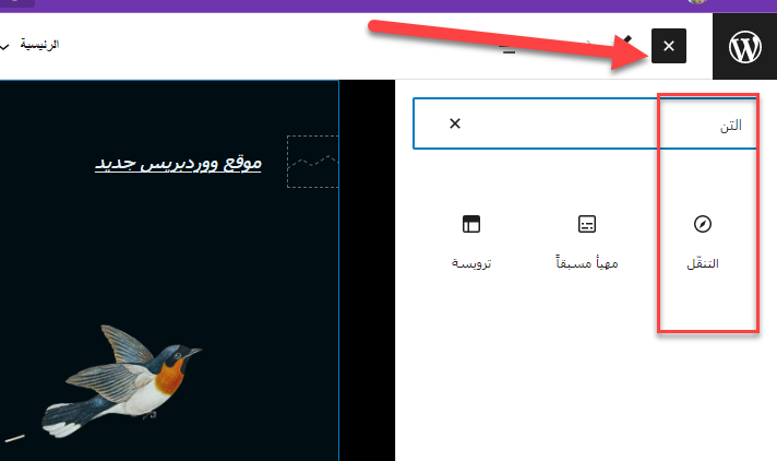 سوف يفتح لك لوحة تحرير القالب بالكامل باستخدام البلوكات الجاهزة، ولكي تقوم باظهار قائمة التنقل او اضافة قائمة جديدة في موقعك، يمكنك الدخول الى تبويب اضافة المكونات في الووردبريس والبحث عن المكون (التنقّل) وقم بالنقر عليه لإدراجه داخل القالب: