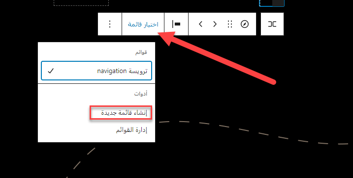 بعد ذلك يمكنك النقر على اختيار قائمة لتظهر لك مجموعة خيارات يمكنك منها اختيار انشاء قائمة جديدة لتقوم بإنشاء قائمة تنقل جديدة في موقعك: