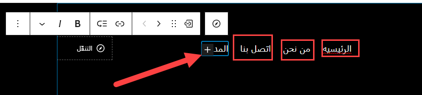 الأن يمكنك النقر على زر الاضافة (+) وتبدأ في إدخال اسماء العناصر التي ترغب في اضافتها داخل قائمة التنقل في موقعك، وبعد كتابة كل نص سيظهر لك خيار ارفاق الرابط حيث تقوم بإدخال الرابط الذي ترغب في تعيينه على كل نص من النصوص التي تقوم باضافتها داخل القائمة: