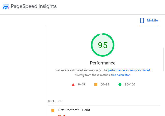 مباشرة الأن قمت بتغيير القالب الى قالب Twenty sixteen الإفتراضي من الووردبريس، وحصل الموقع نسبة 95% على مقياس الأداء، وذلك لأن القوالب الإفتراضية لديه اقل عدد من الإتصالات الخارجية حيث انها تعتبر بداية فارغة وبسيطة للموقع، المهم ان سرعة فتح الموقع زادت بدرجة كبيرة وملحوظة: