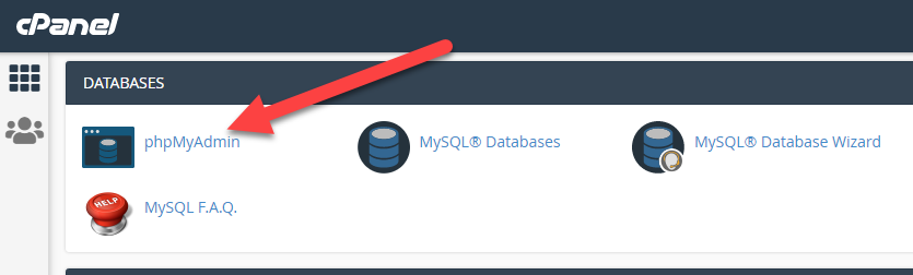 للبدء، سنقوم بالدخول إلى مدير قواعد البيانات على الاستضافة PhpMyaAmin والذي تستطيع الوصول إليه من داخل لوحة تحكم الاستضافة Cpanel: