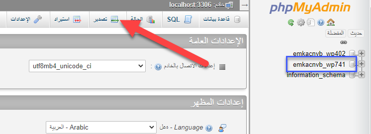 ستفتح لك لوحة التحكم قواعد بيانات الموقع، ستقوم بإختيار قاعدة بيانات الووردبريس، ثم النقر على زر التصدير لكي نقوم بتصدير نسخة طبق الأصل من قاعدة بيانات الموقع: