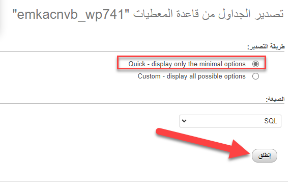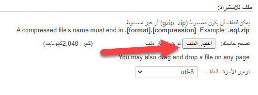 الآن قم بالنقر على زر اختيار الملف، واختر الملف الذي قمت بتصديره من داخل قواعد بيانات موقعك الحي عبر الإنترنت: