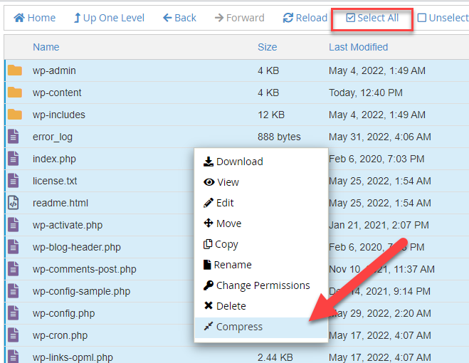 بعد دخولك إلى مدير الملفات، قم بالدخول إلى مجلد تنصيب الووردبريس على الاستضافة وغالبًا ما يكون اسمه Public_html أو أي مجلد آخر قمت بتنصيب الووردبريس داخله، ثم قم باختيار جميع الملفات، وضغطها من خيار Compress: