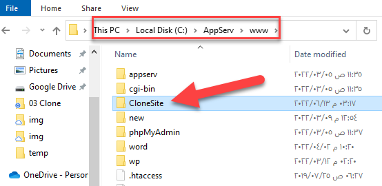 بعد تجهيز بيئة العمل أوفلاين على حاسوبك، قم بالدخول إلى مسار تنصيب البرنامج، ثم بإنشاء مجلد جديد لوضع ملفات الووردبريس داخله، وقد قمت بإنشاء مجلد جديد بإسم CloneSite كمثال:
