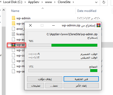 الأن سأقوم بالدخول الى المجلد ولصق المجلد المضغوط الذي قمت بتنزيله في الخطوات السابقة من داخل مدير ملفات الاستضافة، والذي يحتوي على كافة ملفات الووردبريس، ثم أقوم بفك الضغط عليه داخل نفس المجلد CloneSite: