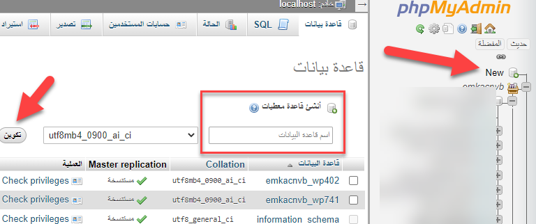 بعد الدخول إلى لوحة تحكم قواعد البيانات، يجب إنشاء قاعدة بيانات جديدة، ولا تنس تسميتها بنفس الاسم الخاص بها على السيرفر المتصل بالإنترنت لموقعك: