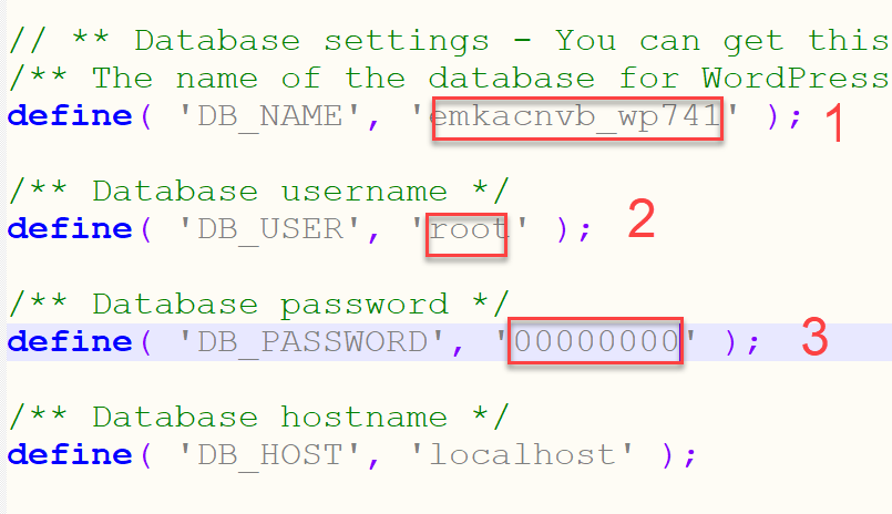 - الحقل الأول: وهو إسم قاعدة البيانات DB_NAME وهو خاص باسم قاعدة البيانات حيث يمكنك تركه كما هو في حال قمت بإنشاء قاعدة بيانات السيرفر المحلي بنفس اسم قاعدة البيانات الموجودة على الموقع الحي.