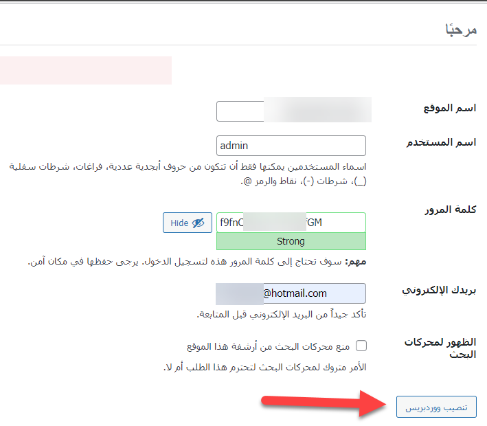 سيطلب منك تعيين بيانات الموقع مثل عنوان الموقع، واسم المستخدم للدخول إلى الووردبريس، وكذلك كلمة المرور، وايضًا بريدك الإلكتروني، ثم بكتابة البيانات والنقر على زر تنصيب ووردبريس، وستتم عملية التنصيب تلقائيًا على قواعد البيانات التي تم إنشاؤها على السيرفر المحلي: