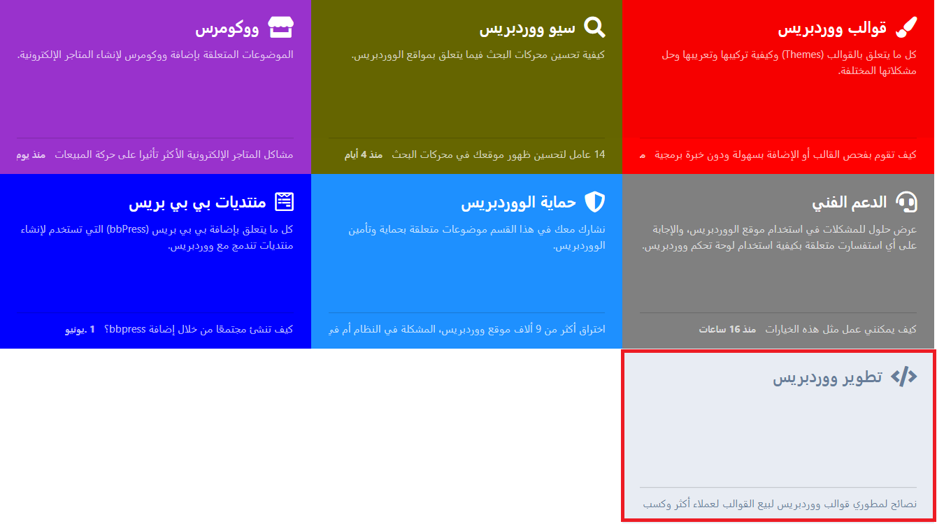موقع عرب ووردبريس الذي يتبع له هذا المنتدى يعتبر من أقدم المواقع العربية التي توفر شروحات لتعلك ووردبريس وهو ويتميز بوجود منتديات ووردبريس التي تضم قسم متخصص في مقالات تطوير ووردبريس والتي يمكنك من خلالها طرح نقاشات ومواضيع متقدمة حول ووردبريس، والتواصل مع أشخاص لهم اهتمامات مشابهة في مجال تطوير ووردبريس..