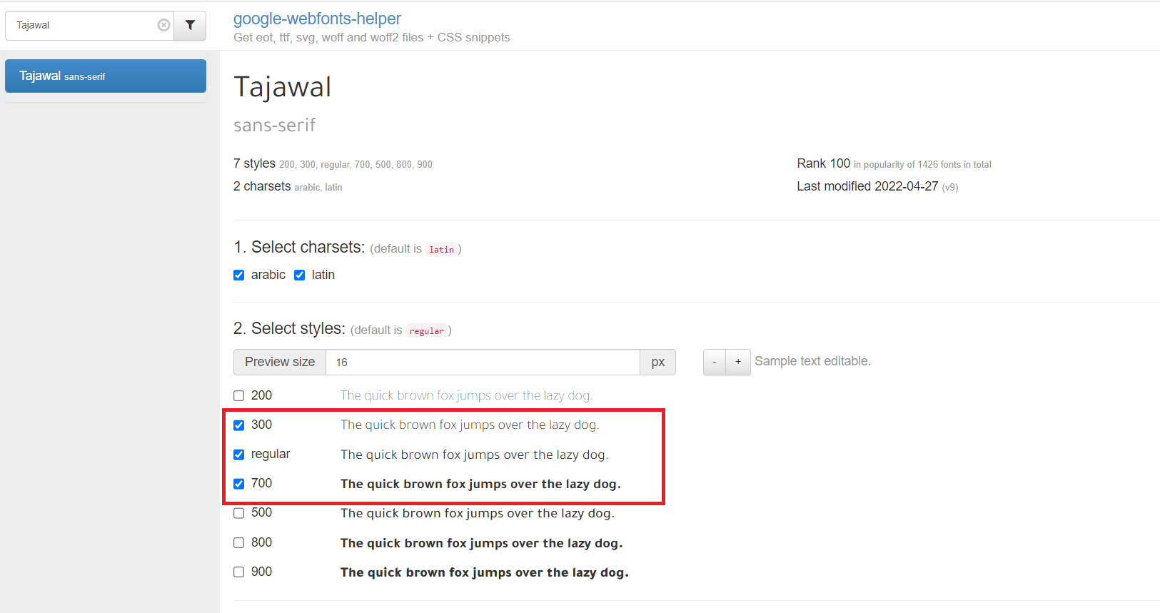 انتقل للموقع [سجل الدخول لترى الرابط] واكتب اسم الخط الذي تريده في مربع البحث، هنا اخترنا خط Tajawal وحددنا الأنماط. المطلوبة للخط