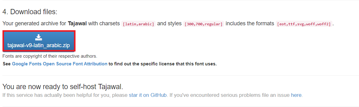 بعد تحديد خياراتك اضغط على زر التحميل في الأسفل ليتم تحميل ملف مضغوط يحتوي على كافة ملفات الخطوط المطلوبة.
