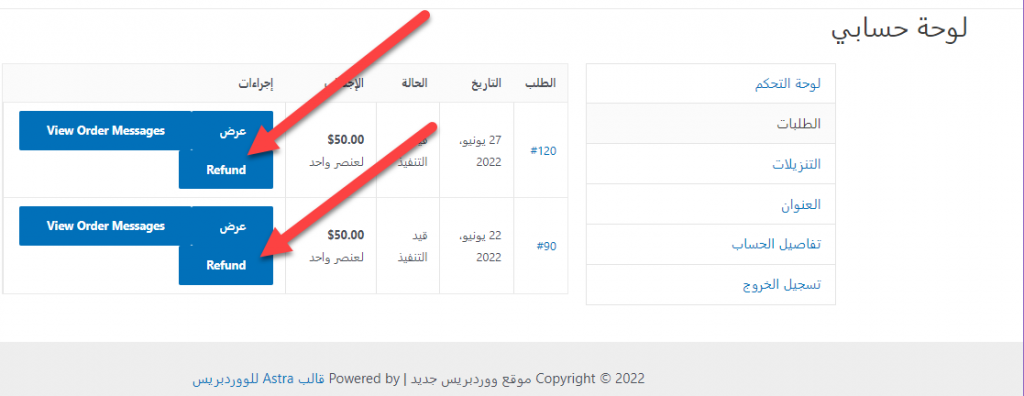 عند تفعيل خيار إرجاع المنتج سيكون خيار الإرجاع متاحا داخل لوحة تحكم حساب العميل في المتجر، ويكون لديه القدرة على إرسال طلب الإرجاع أو الإستبدال بسهولة.