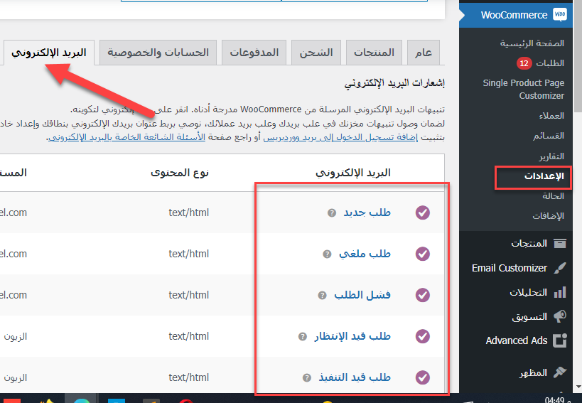 طريقة تعديل رسائل البريد الالكتروني في ووكومرس