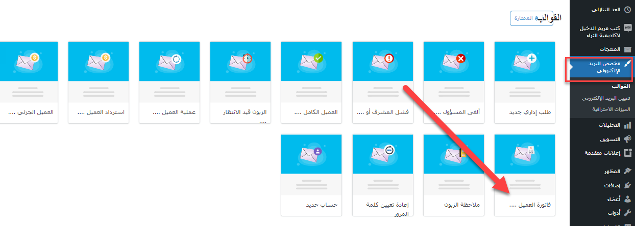 بعد تنصيب وتفعيل الإضافة، قم بالدخول إلى تبويب الإعدادات الخاص بها للبدء في التحكم في التصميم والمظهر الخاص برسائل البريد الإلكتروني للمتجر، والتي تجد داخلها كافة نماذج رسائل البريد الإلكتروني داخل المتجر، مثل رسالة تعيين كلمة المرور، وتسجيل زبون جديد، وغيرها. سوف أختار على سبيل المثال التعديل على نموذج (فاتورة العميل) الذي يقوم بإرسال الفاتورة للعميل بعد إتمام الطلب مباشرة:
