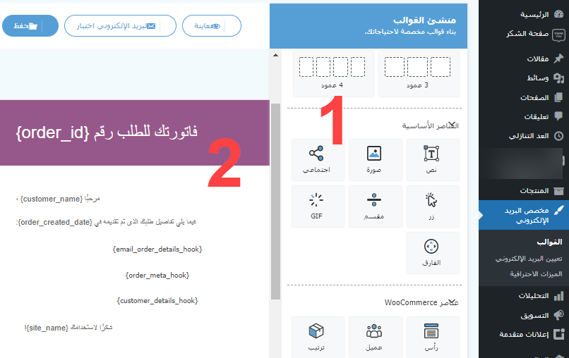 بعد الدخول إلى القالب الخاص برسالة فاتورة العميل، ستجد أن الشاشة تنقسم إلى نصفين، النصف الأول (1) يحتوي على العديد من المكونات والعناصر المرئية مثل الصور والنصوص والروابط الأزرار وروابط التواصل الإجتماعي وغيرها من المكونات التي يمكنك سحبها بالماوس وإدراجها داخل النصف الثاني (2) وهو الشكل النهائي الذي يتم ارساله للعميل بعد إتمام الطلب.