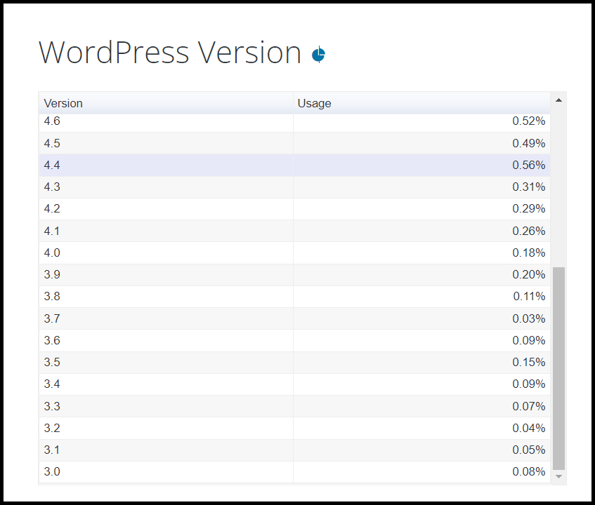 دليلي في ذلك الصورة السابقة المأخوذة من [سجل الدخول لترى الرابط]-,WordPress%20Version,-Version) والتي تؤكد أن هناك نسبة من المواقع لا تزال تستخدم نسخ قديمة من الووردبريس تحديدًا النسخ قبل الإصدار 4.4 الذ ولم يقوموا بتحديث الووردبريس إلى أحدث إصدار حتى الآن.