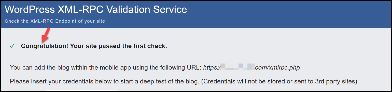 إذا هنأك بعلامة الصح الخضراء وكلمة Congratulation فهذا يعني أن xml-rpc يعمل في موقعك وليس مُغلقًا.