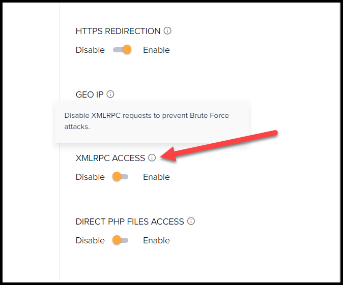 فمثلا الصورة السابقة مأخوذة من سيرفر cloudways والذي يوفر إمكانية إغلاق وفتح الوصول عبر ميزة الـ XMLRPC من إعدادات الموقع.