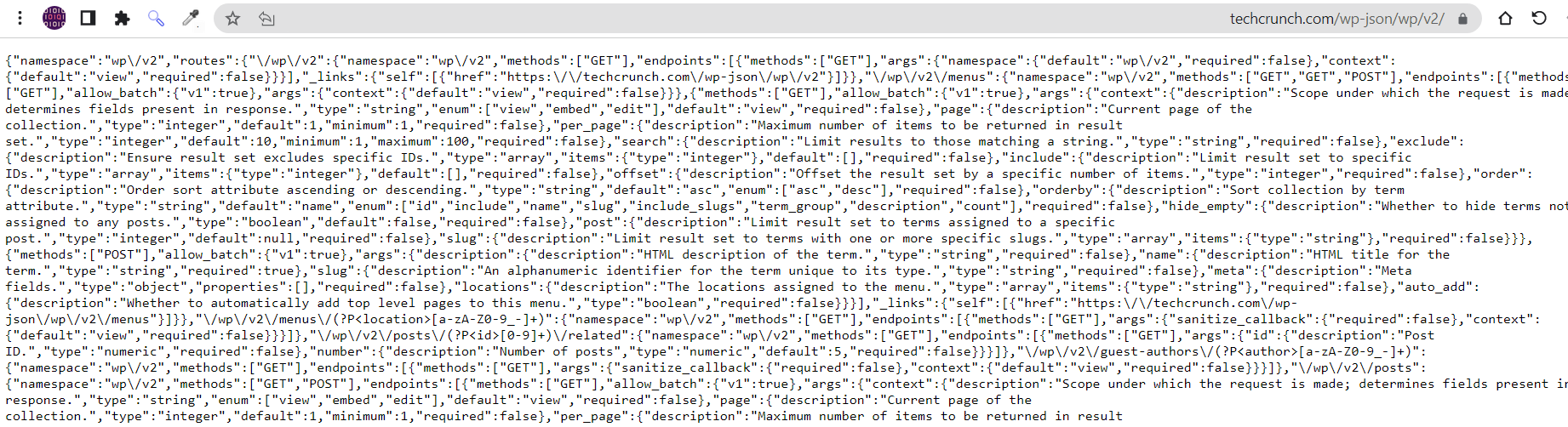 فهذه الطلاسم التي تراها هنا هي جميع مقالات موقع الويب الخاصة بموقع techcrunch والذي وفر لك الوصول لهذه المقالات بشكل استجابة json هو واجهة api المجانية التي يوفرها الموقع والتي عليك أن تعرف كيف تستفيد منها في تطبيقك.